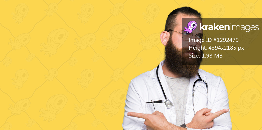 Young blond doctor man with beard wearing medical coat Pointing to both sides with fingers, different direction disagree