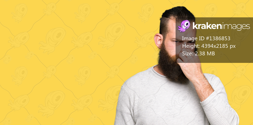 Young blond man wearing casual sweater smelling something stinky and disgusting, intolerable smell, holding breath with fingers on nose. Bad smells concept. - Kraken Images