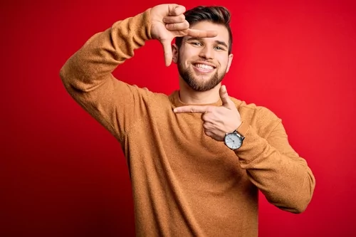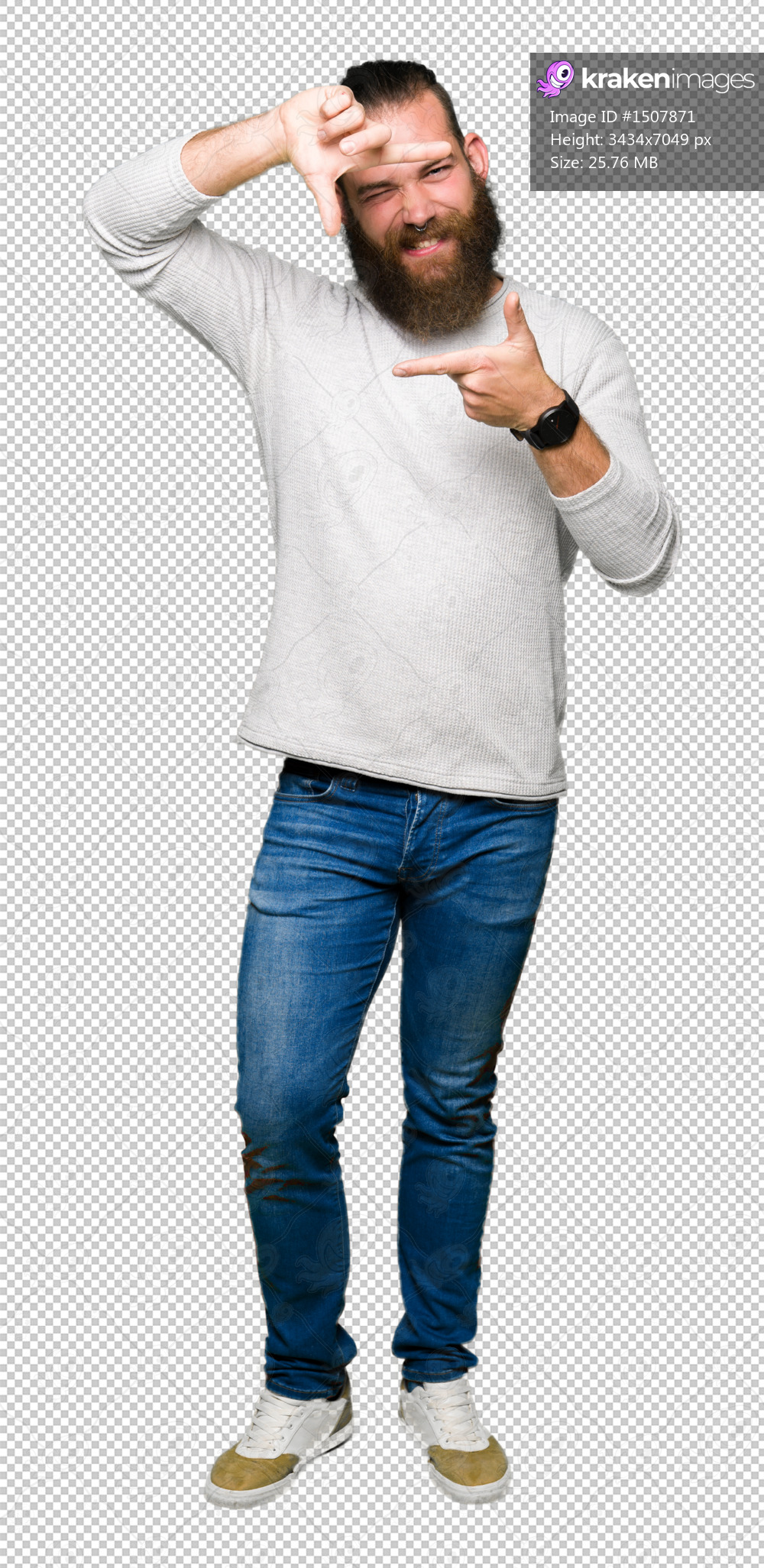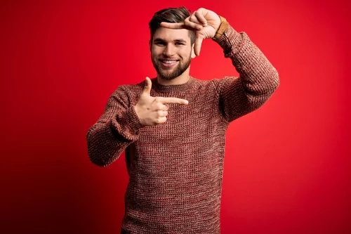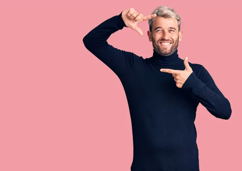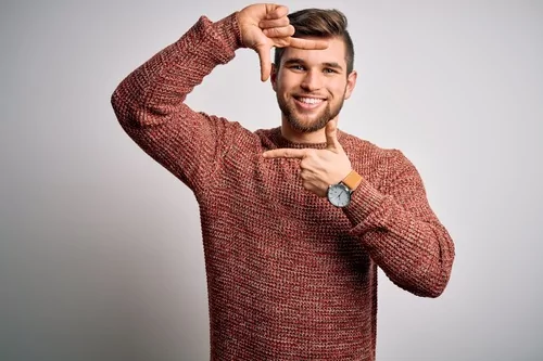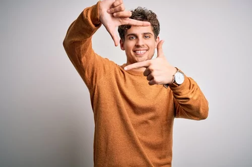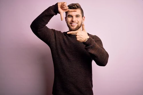 Young blond man wearing casual sweater smiling making frame with hands and fingers with happy face. Creativity and photography concept.