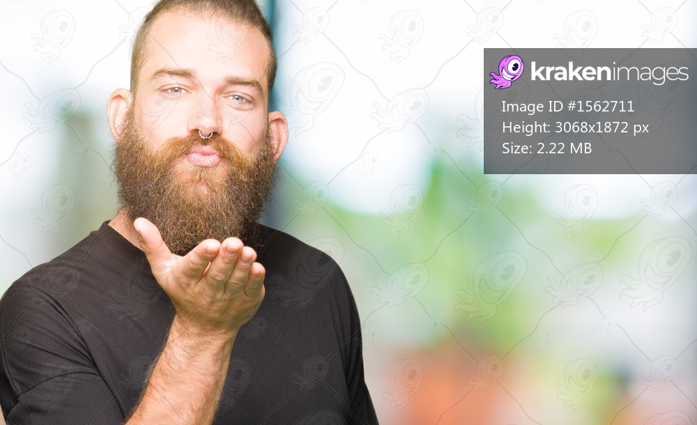 Young blond man wearing casual t-shirt looking at the camera blowing a kiss with hand on air being lovely and sexy. Love expression.