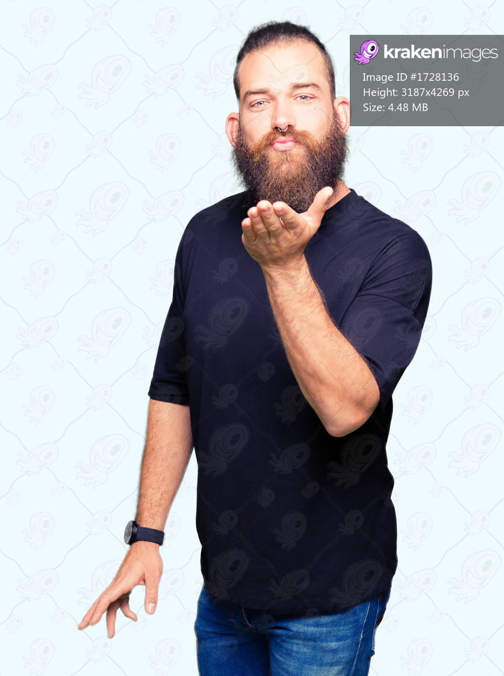 Young blond man wearing casual t-shirt looking at the camera blowing a kiss with hand on air being lovely and sexy. Love expression.
