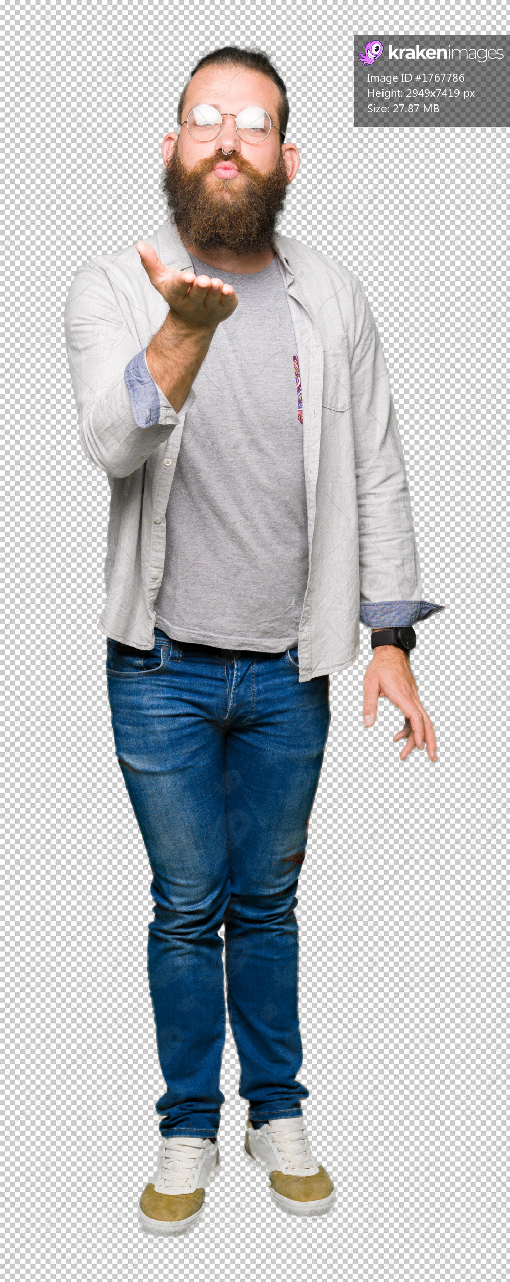 Young blond man wearing glasses looking at the camera blowing a kiss with hand on air being lovely and sexy. Love expression.