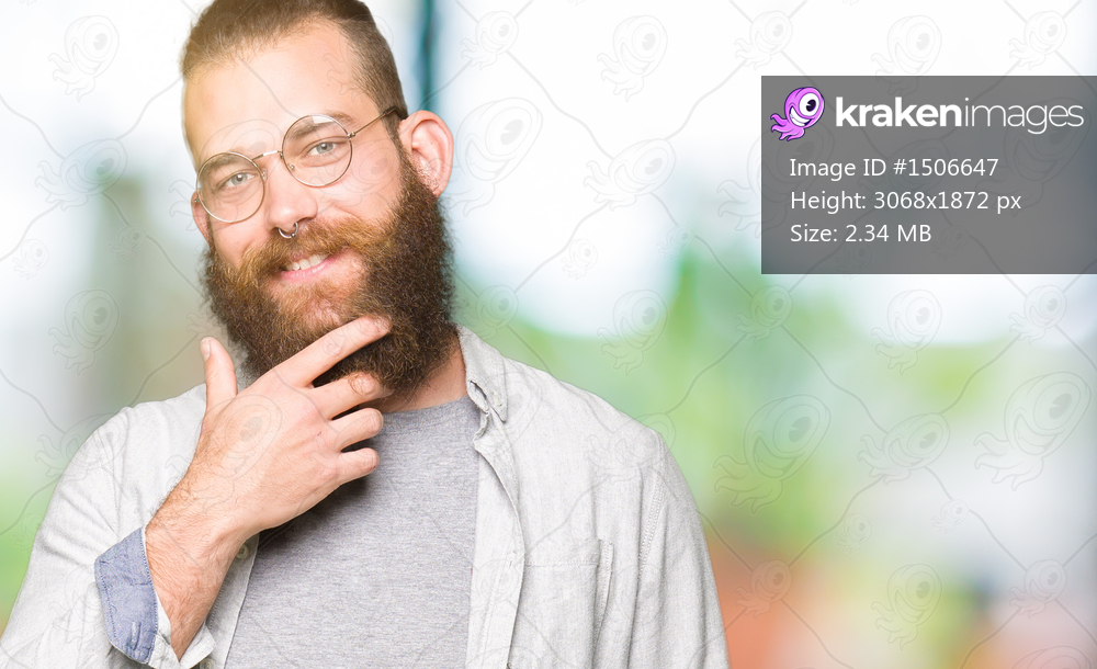 Young blond man wearing glasses looking confident at the camera with smile with crossed arms and hand raised on chin. Thinking positive.