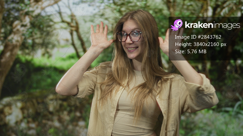 Young blond woman with glasses wearing beige shirt covers eyes and smiles in sunlit forest; playful surprise.