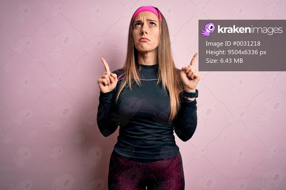 Young blonde fitness woman wearing sport workout clothes over isolated background Pointing up looking sad and upset, indicating direction with fingers, unhappy and depressed. - Kraken Images