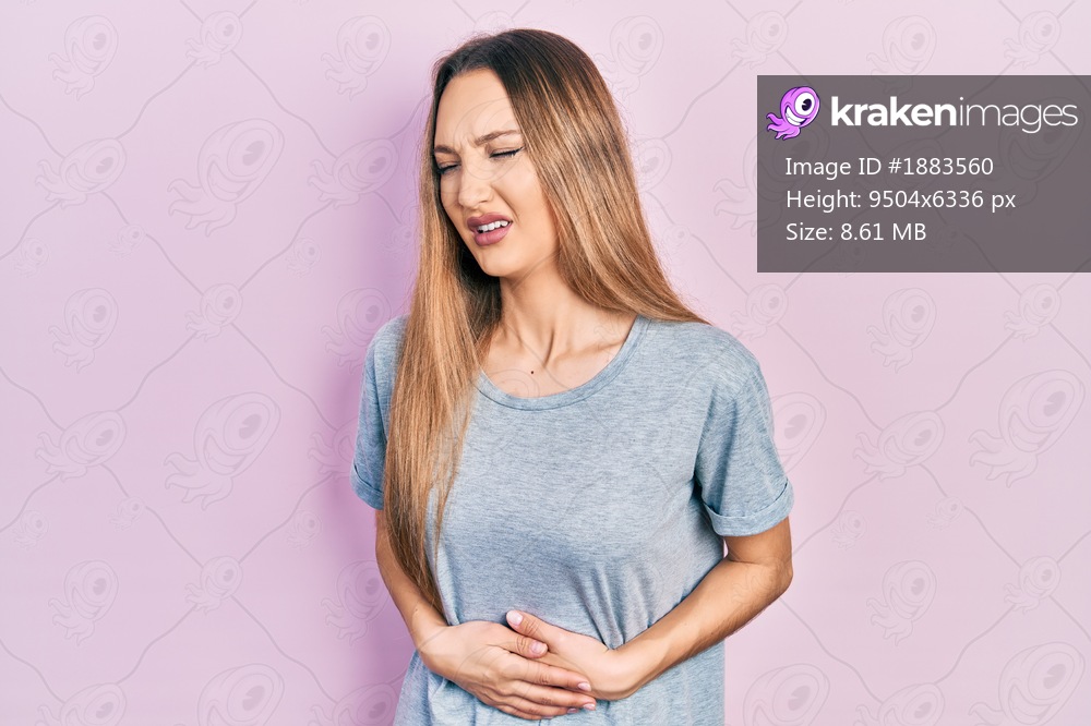 Young blonde girl wearing casual t shirt with hand on stomach because nausea, painful disease feeling unwell. ache concept.