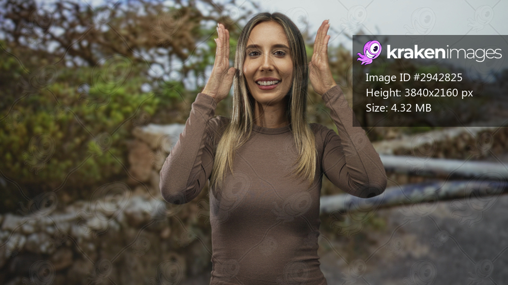 Young blonde hispanic woman framing face with hands while smiling in park with green trees and stone wall and pathway; serenity.