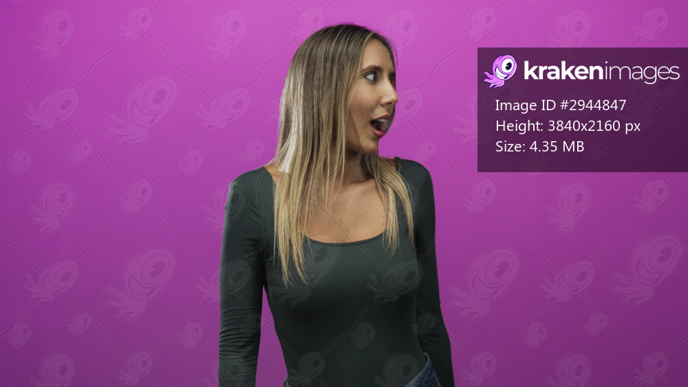 Young blonde hispanic woman yawning with open mouth and face turned in studio against magenta wall; surprise expression.