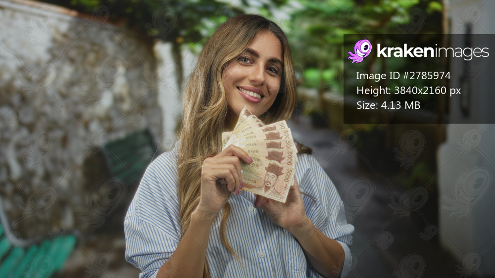 Young blonde korean woman smiles while fanning won bills with bare hands in narrow garden alley; wealth happiness.