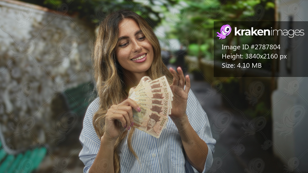 Young blonde korean woman smiles while fanning won bills with bare hands in narrow garden alley; wealth happiness.