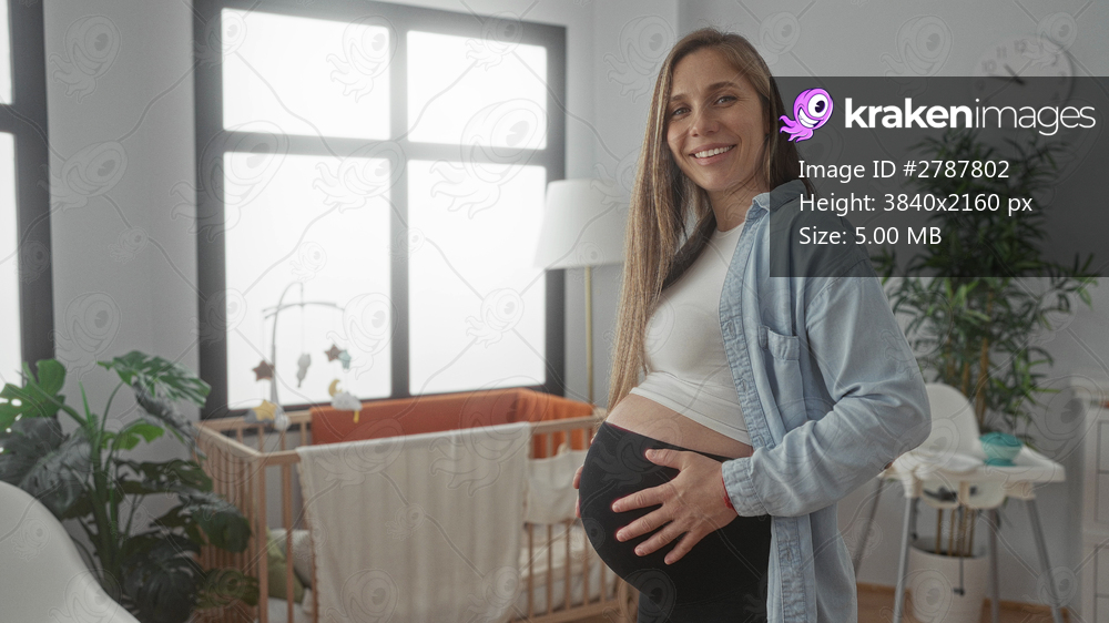 Young blonde pregnant woman in baby room holding stomach surrounded by crib plant and clock creating a serene home atmosphere
