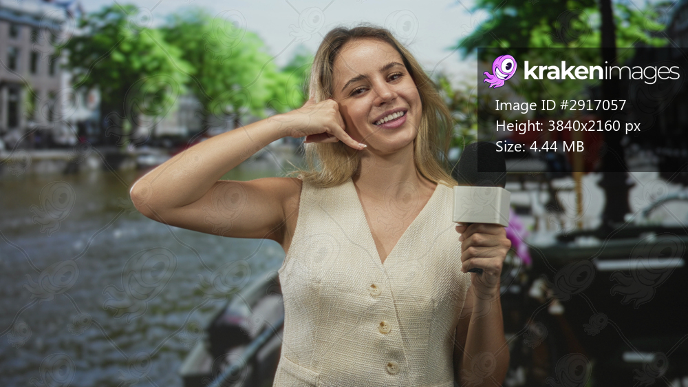 Young blonde reporter woman holding microphone and making phone hand gesture by canal on street in amsterdam; cheerful broadcast fun.