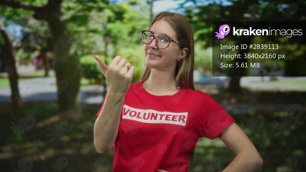 Young blonde volunteer woman in red shirt pointing finger at camera in forest; encouragement invitation.