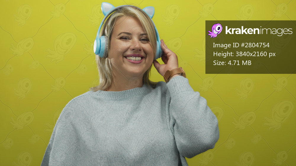 Young blonde woman adjusting blue cat ear headphones against lime green studio wall; music enjoyment.