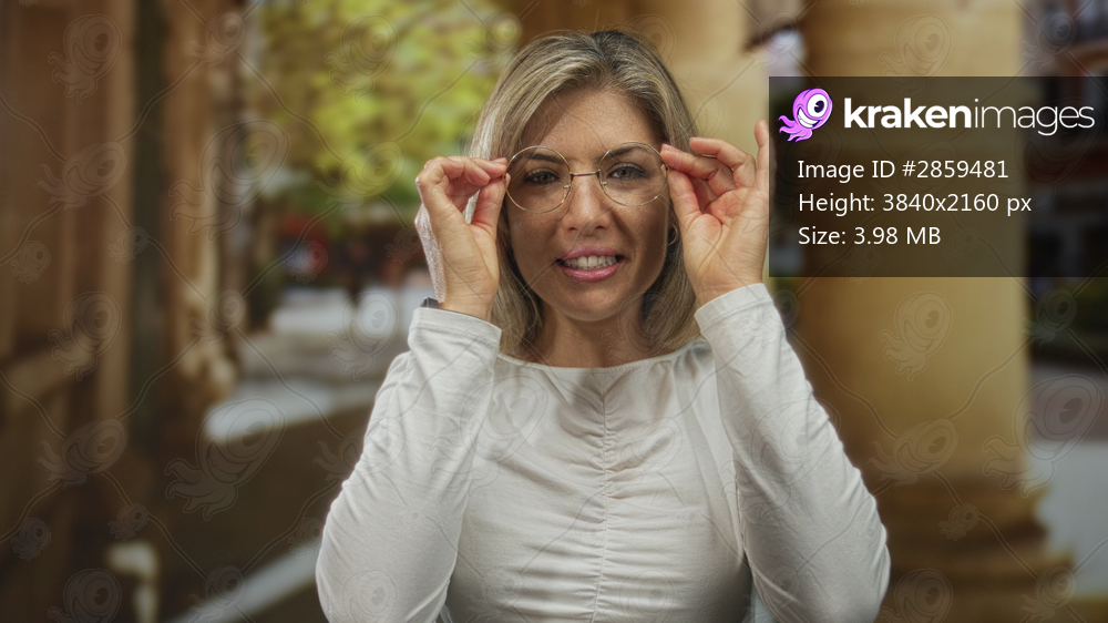 Young blonde woman adjusts gold glasses with delicate hands in a sunlit stone building ruin; curiosity.