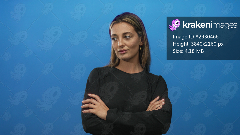 Young blonde woman with arms crossed and eyes closed in studio on bright blue backdrop; confidence calm contemplation.