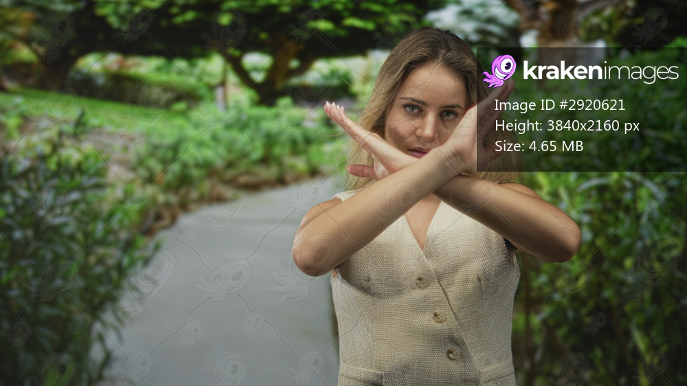 Young blonde woman arms crossed x on park pathway blocking face with palms over chest in green park walkway among shrubs and trees; defiance boundary.