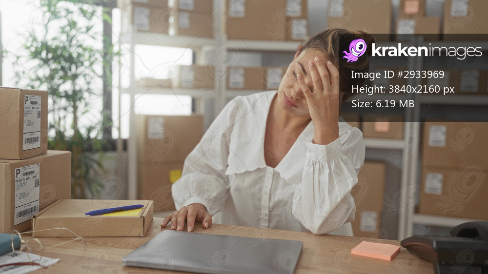 Young blonde woman at packing desk scanning parcels and using laptop with labeled boxes on shelves in building; tired small business.