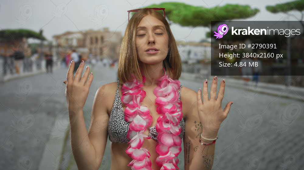 Young blonde woman with bare arms breathing in and out gesture on city street; relaxation mindfulness wellness calm.
