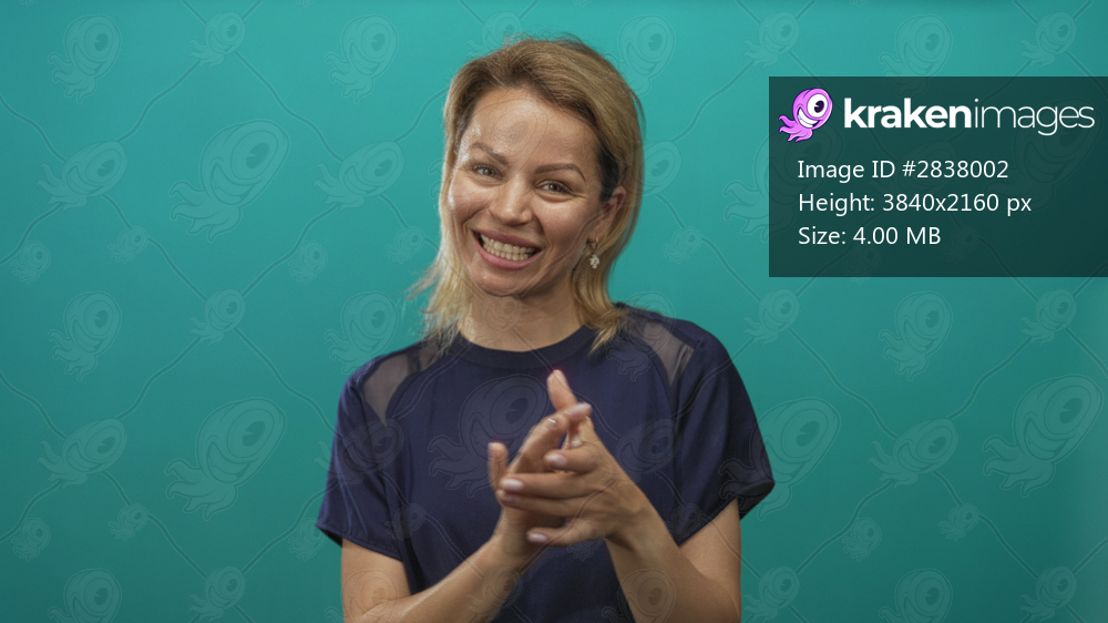 Young blonde woman beaming and smiling claps hands and points finger on bright turquoise studio set; happiness joy delight cheerfulness.