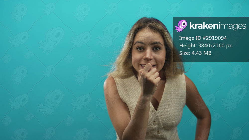 Young blonde woman biting nails with hand to mouth in turquoise studio, sleeveless vest and exposed arms; anxiety.