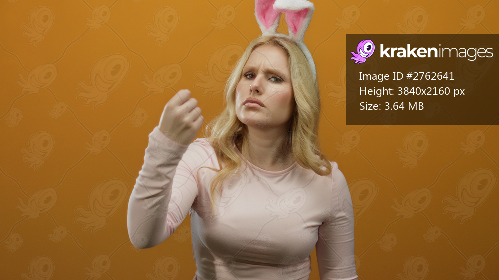 Young blonde woman with bunny ears looking funny in pink shirt against an orange background expressing playful emotion in a humorous setting