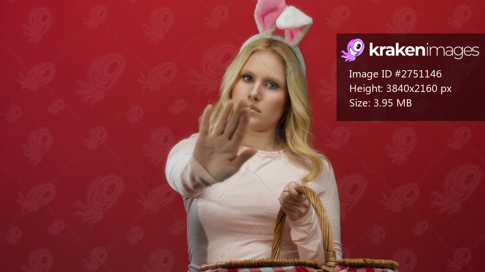 Young blonde woman with bunny ears and pink shirt makes stop gesture against red background, holding picnic basket humorously.
