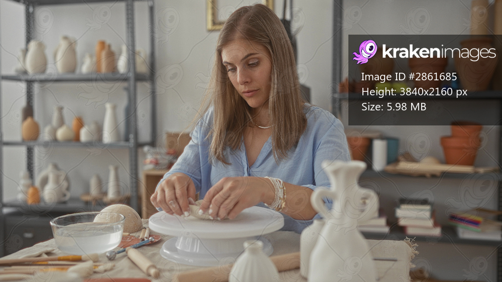 Young blonde woman carefully shaping a block of wet clay on a rotating pottery wheel in her bright art studio; concentration.