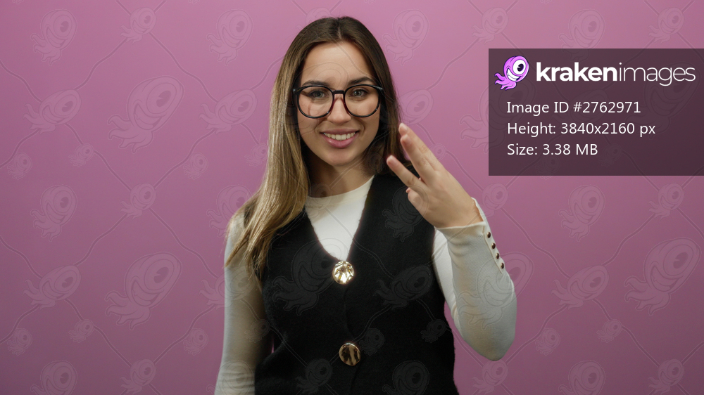 Young blonde woman celebrates excitedly, counting with fingers against isolated pink background, showing confidence and happiness.