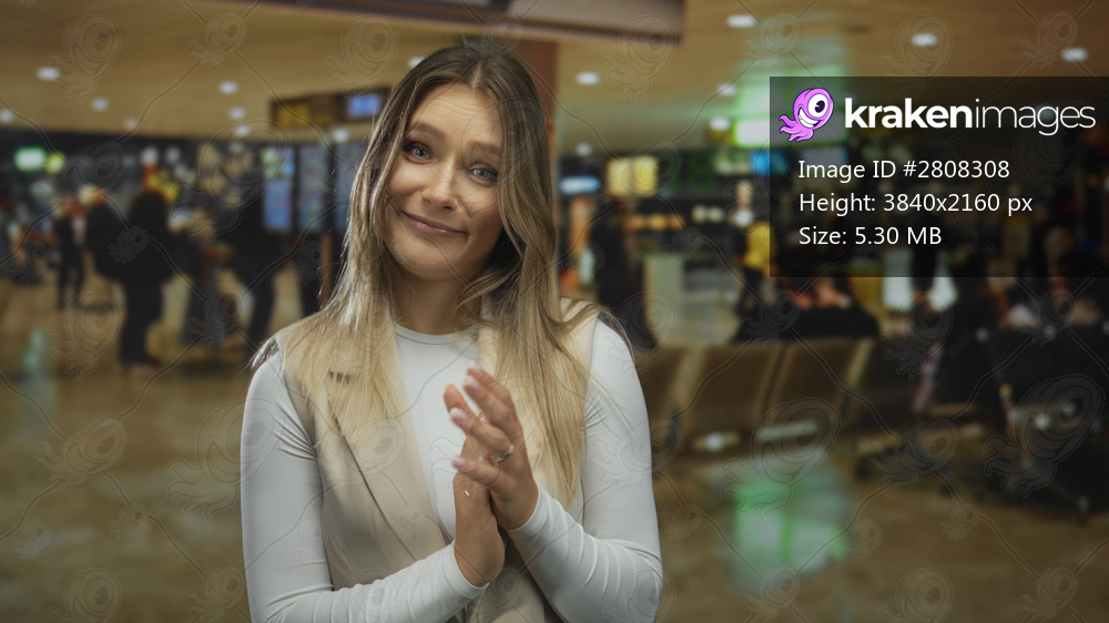 Young blonde woman clapping in a busy airport terminal with blurred people and chairs in the background showcasing travel emotion and anticipation indoors. - Kraken Images