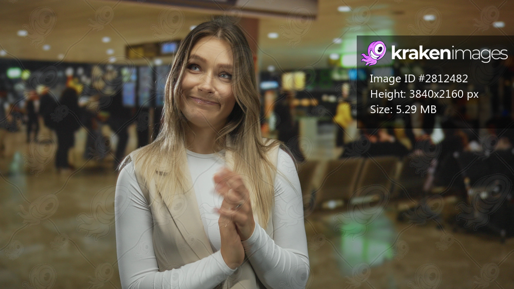 Young blonde woman clapping in a busy airport terminal with blurred people and chairs in the background showcasing travel emotion and anticipation indoors. - Kraken Images