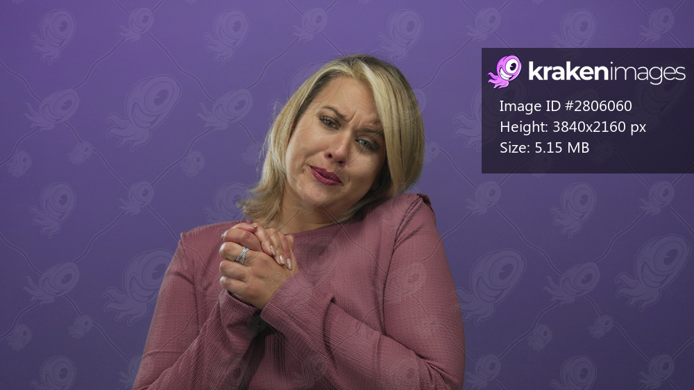 Young blonde woman with clasped hands to chest smiling in a bright purple studio setting; happiness.