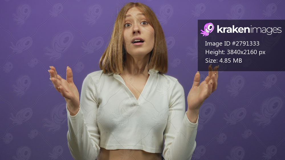 Young blonde woman clenches fists under bright lights in a photo studio; frustration stress tension.