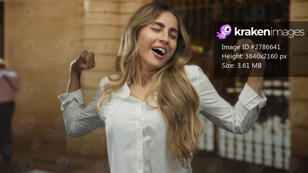 Young blonde woman clenching fists by shoulders in stone courtyard with closed eyes and soft smile; joy gratitude.