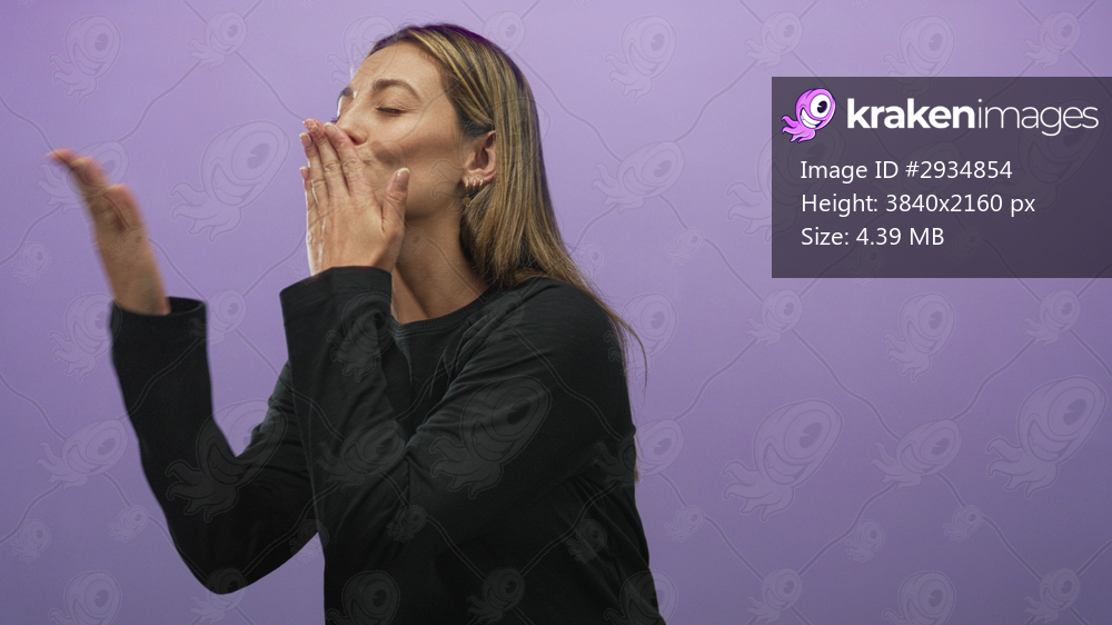 Young blonde woman with closed eyes blowing a kiss with both hands over mouth, fingers visible, head slightly tilted in a purple studio; affection.