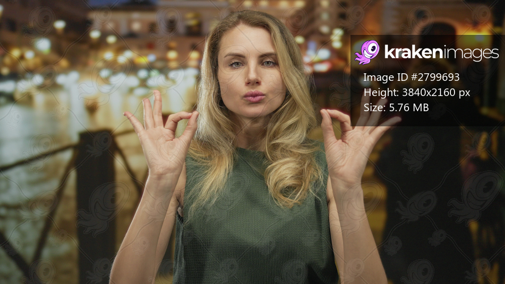 Young blonde woman with closed eyes breathing deeply on a bustling city street at night, surrounded by blurred urban lights and people, conveying a sense of calm amidst chaos - Kraken Images