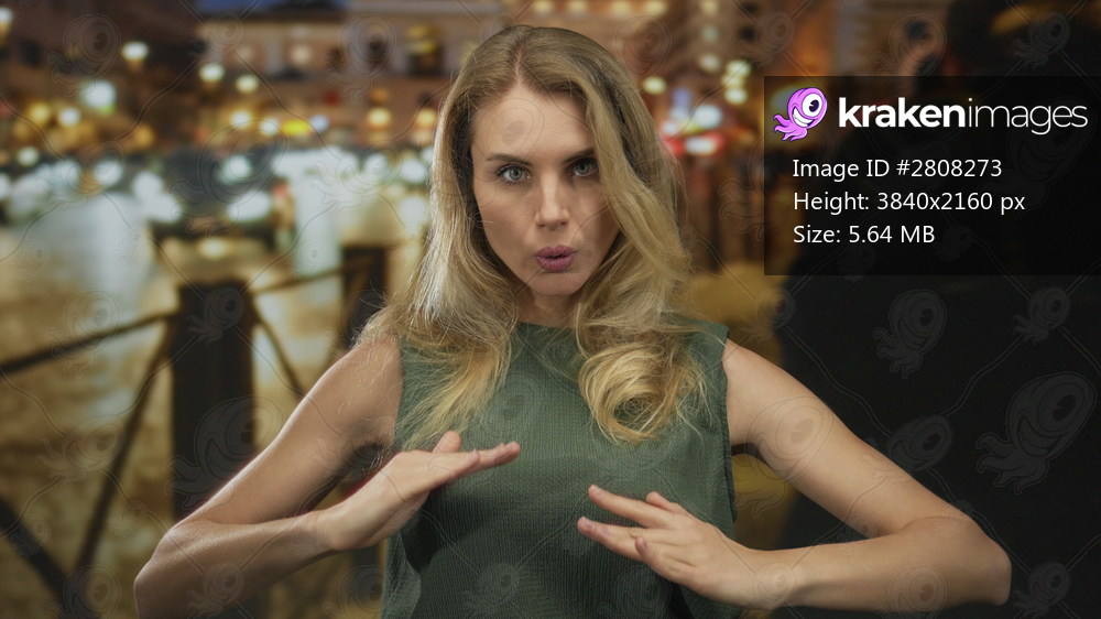 Young blonde woman with closed eyes breathing deeply on a bustling city street at night, surrounded by blurred urban lights and people, conveying a sense of calm amidst chaos - Kraken Images