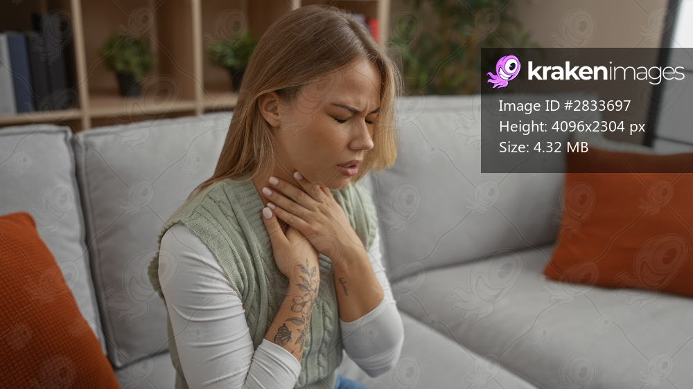 Young blonde woman clutches neck on grey couch in building interior near bookshelf with potted plants and orange pillows visible; distress.