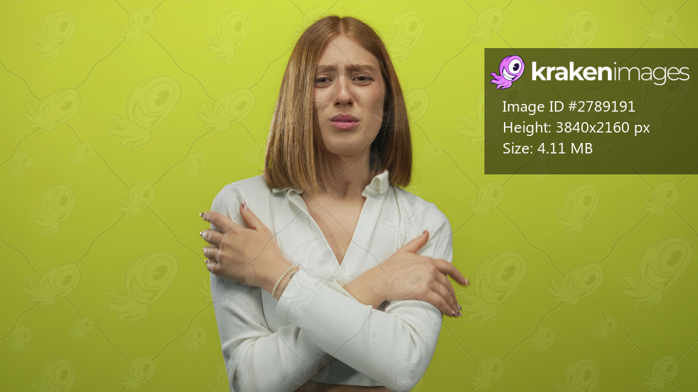 Young blonde woman clutching arms over chest in a yellow studio; cold discomfort vulnerability shivering.