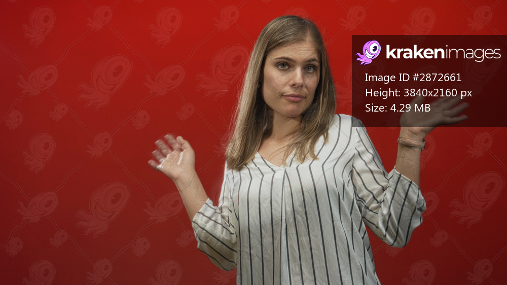 Young blonde woman with confused expression showing bare hands shrug gesture in studio with red background; uncertainty doubt confusion.