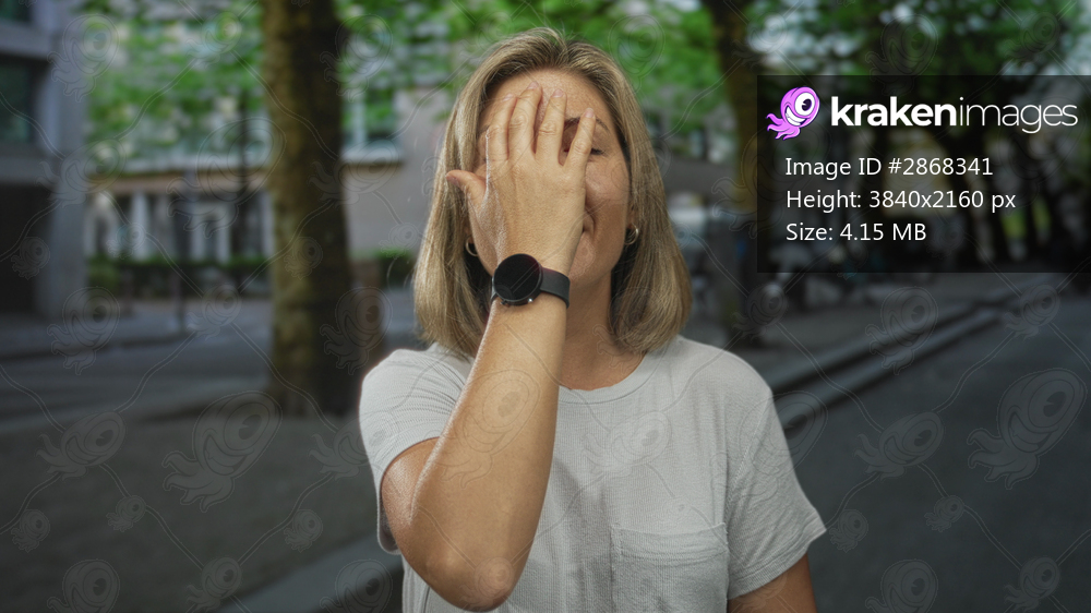 Young blonde woman covering eye with hand on urban street while laughing, smartwatch on wrist visible; playful joy.