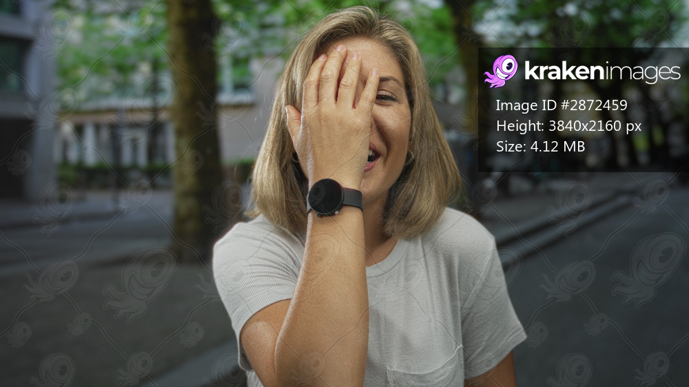 Young blonde woman covering eye with hand on urban street while laughing, smartwatch on wrist visible; playful joy.