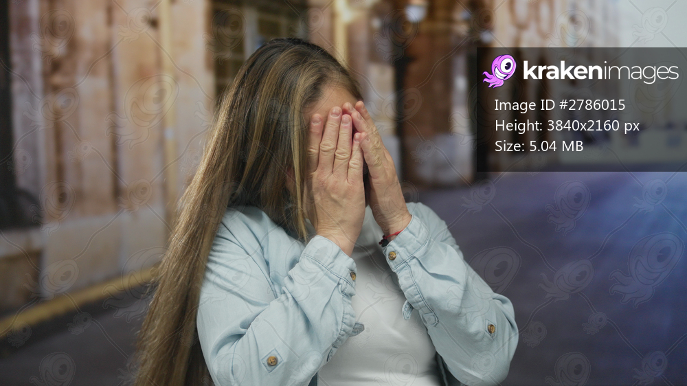 Young blonde woman covering eyes with hand peekaboo on city street; playfulness happiness.