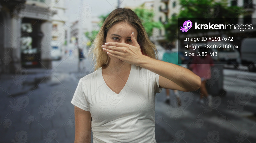 Young blonde woman covering face with hand on a busy city street near storefronts and parked vans; embarrassment privacy.