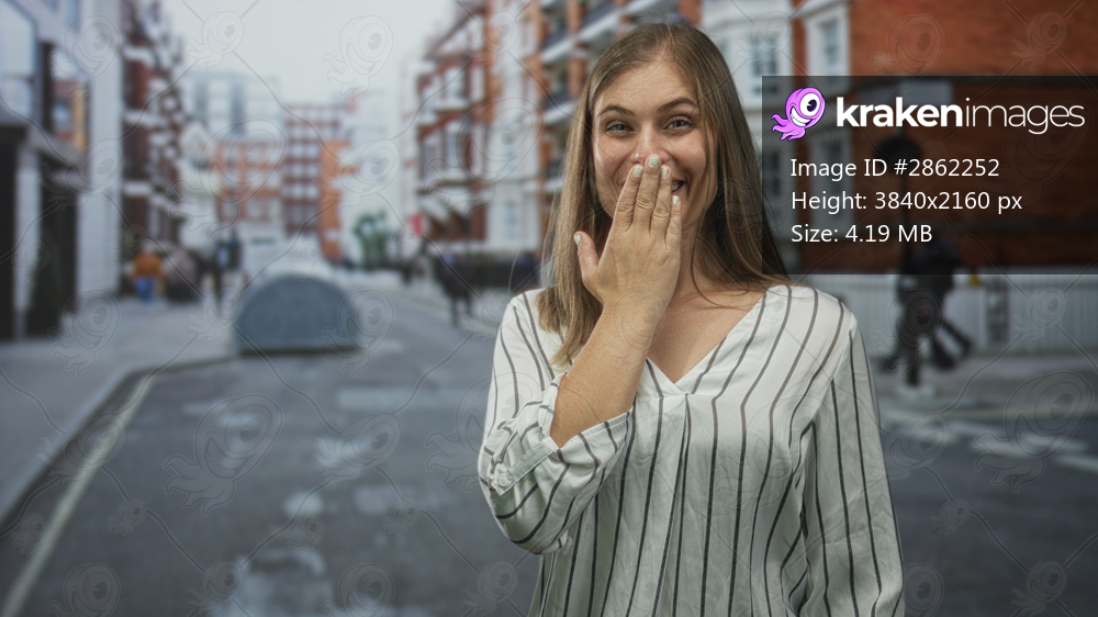 Young blonde woman covering mouth with hand on bustling city street beside brick building facade under daytime light; surprise.