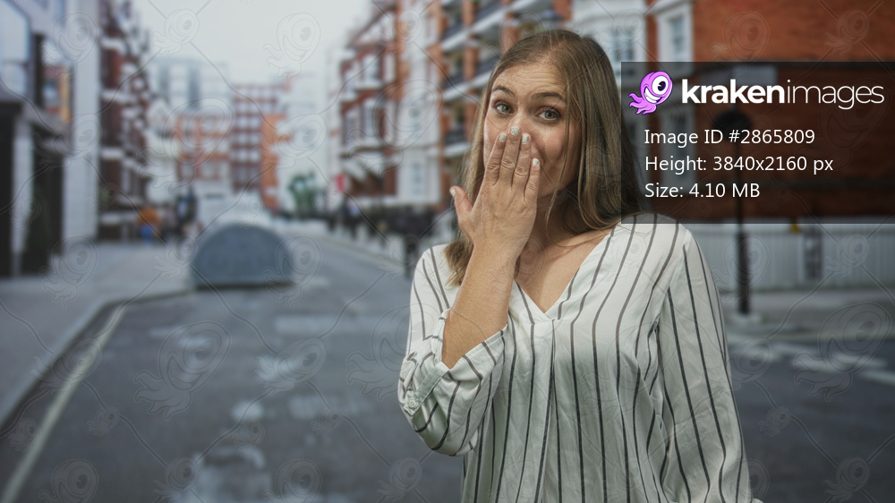 Young blonde woman covering mouth with hand on bustling city street beside brick building facade under daytime light; surprise.