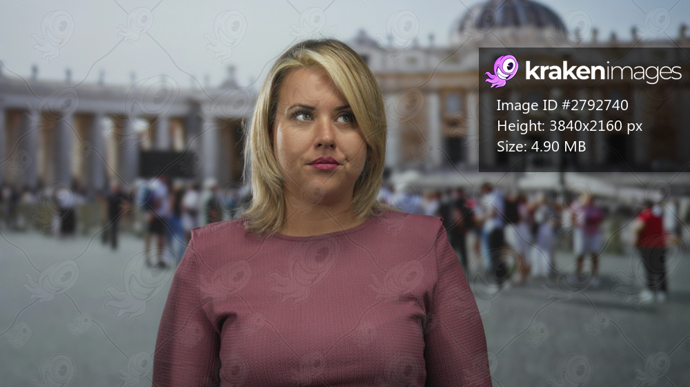 Young blonde woman covers mouth with hand on street with vatican facade visible under clear sky; surprise reaction culture.