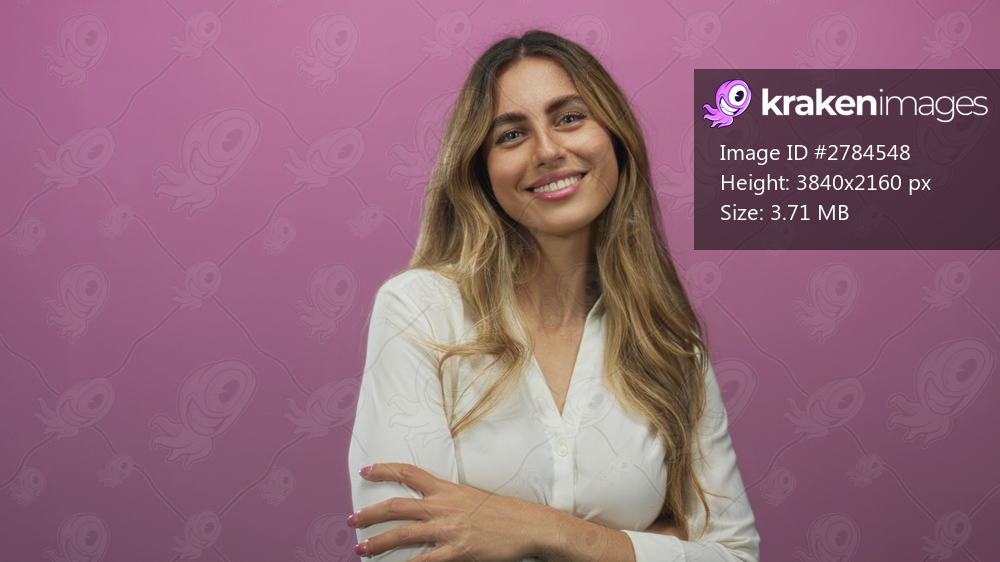 Young blonde woman crosses arms in studio portrait; confidence empowerment.