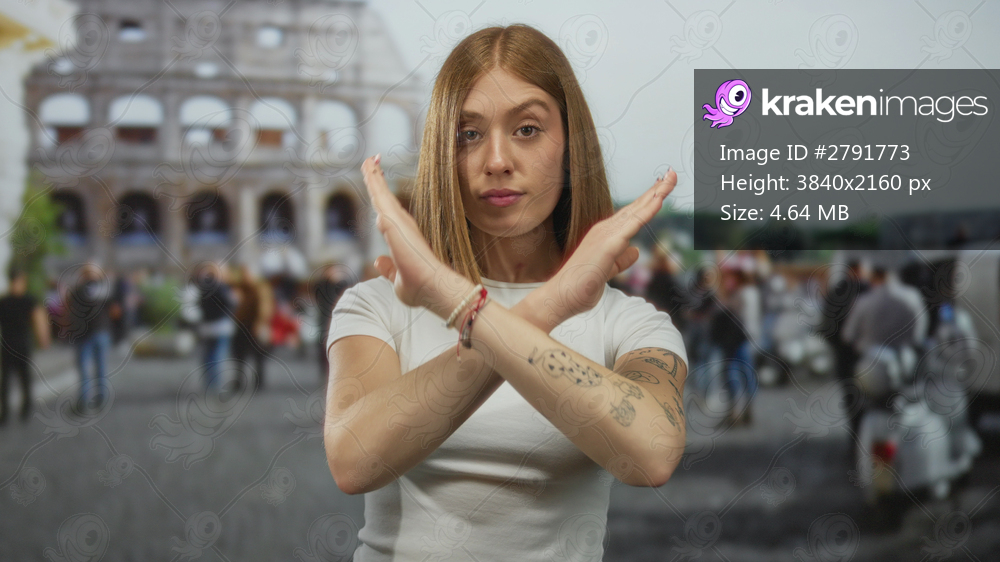 Young blonde woman crosses tattooed bare arms for stop gesture at roman coliseum; denial rejection protest.