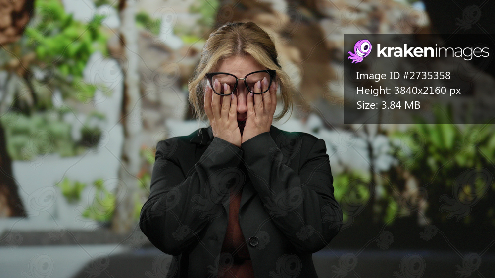 Young blonde woman crying with hands on face in an outdoor park setting, expressing emotion and distress amidst a natural background, wearing glasses and a black jacket. - Kraken Images